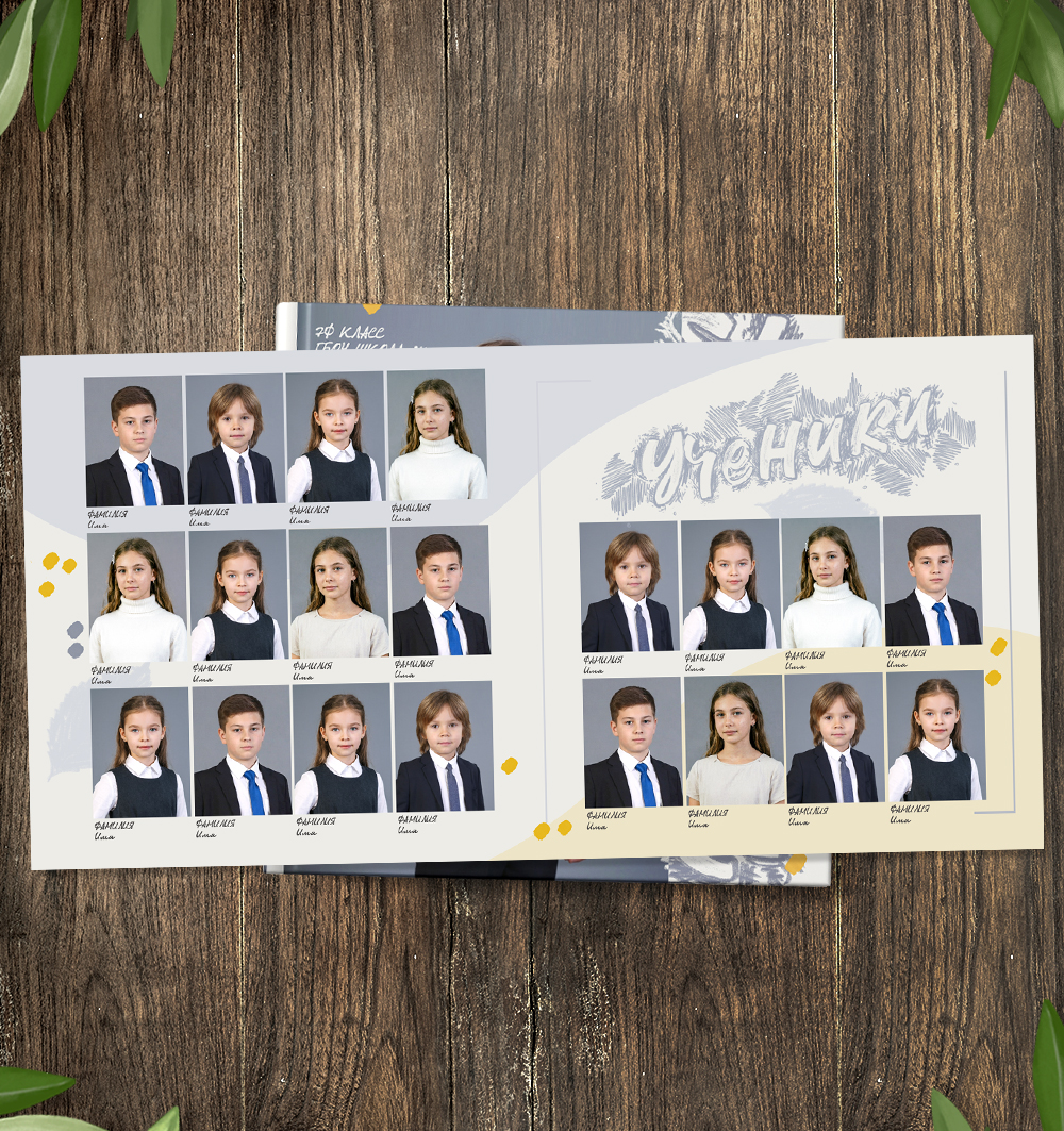 Слова "Выпуск", "Выпускной альбом", "Ученики", "Учителя", "Школа" отрисованы специально для макета (1 слово - 1 слой ).