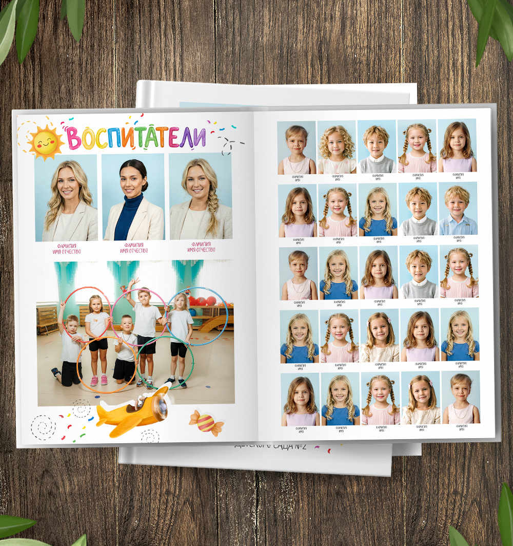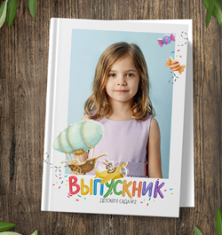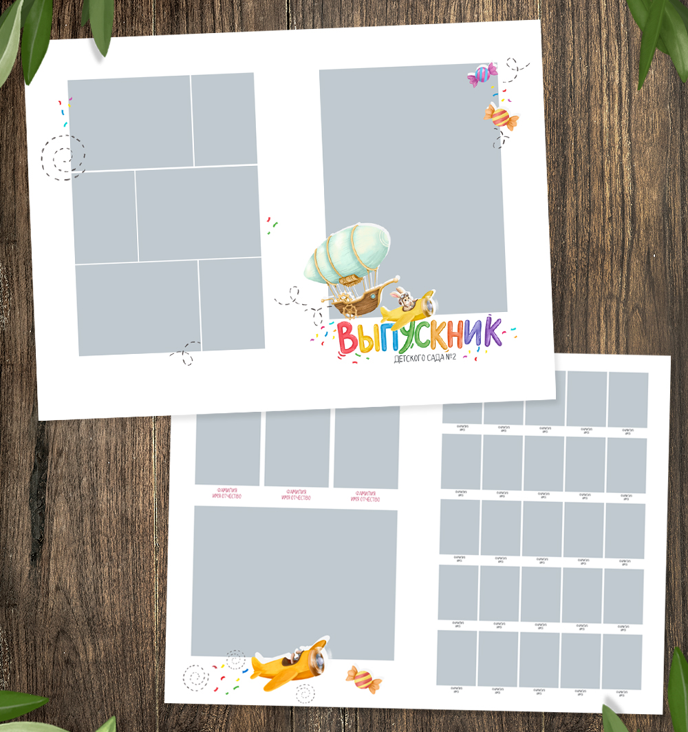 Обложка и разворот. Обложка с двумя вариантами надписей "Выпускной" и "Детский сад" (рисунки, не редактируются).