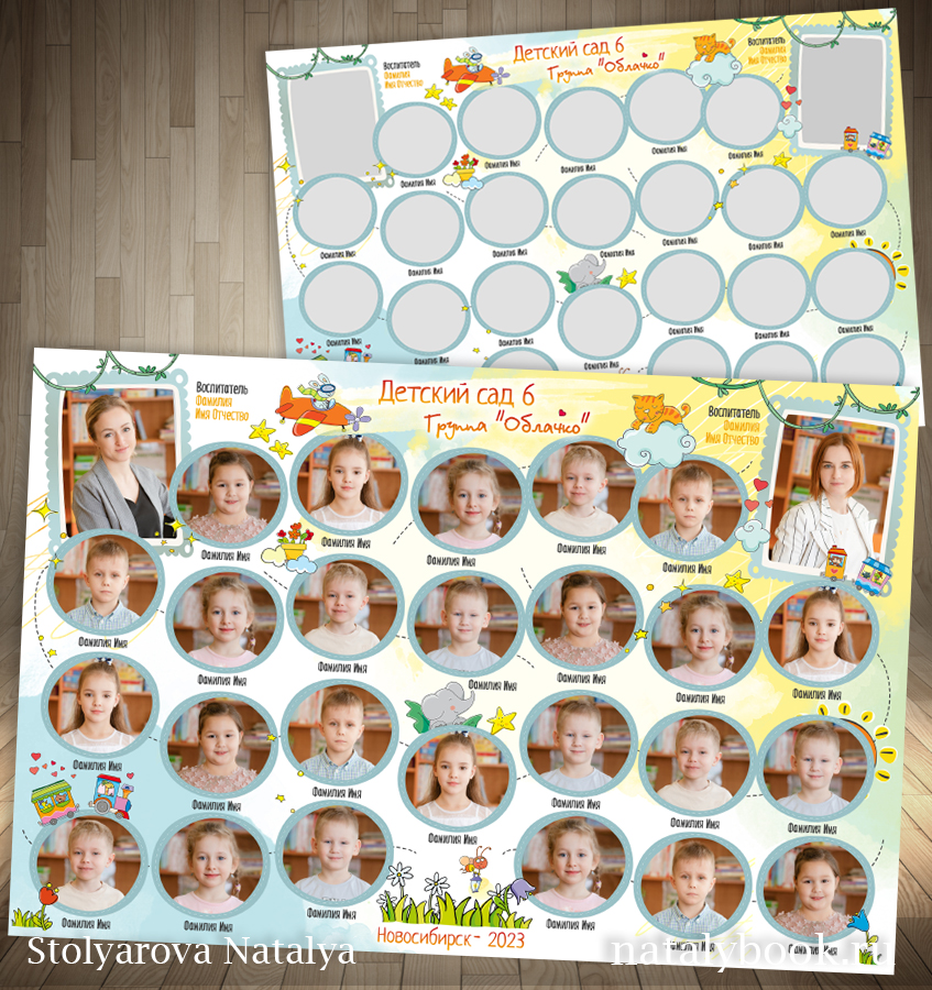 Макет послойный, рамочки и элементы все отдельно, поэтому макет можно корректировать под свои задачи (количество детей и воспитателей, надписи, элементы).