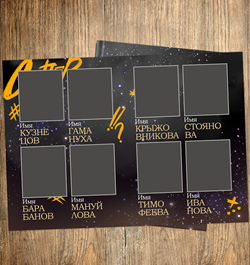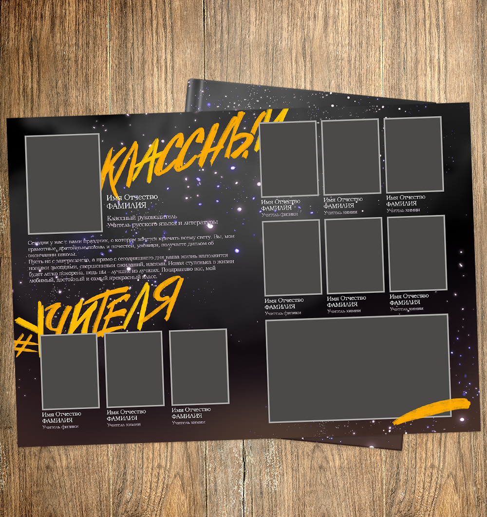 Послойный PSD. Отдельно от фона слой с мелкими звездами. Каждое отрисованное слово на отдельном слое, например "выпускной", "классный", "#учителя" и пр. Также на последнем развороте в скрытых слоях годы 2025, 2026, 2027, далее макет будет обновлен и добавлены годы с 28 по 30 и т.д.