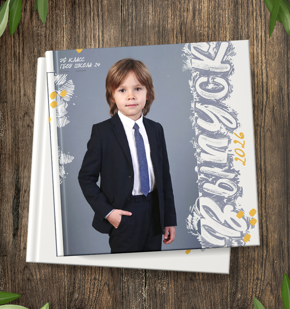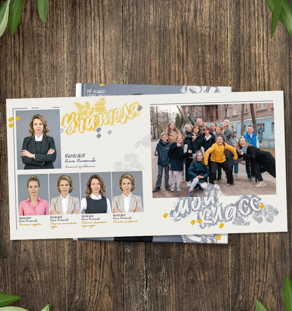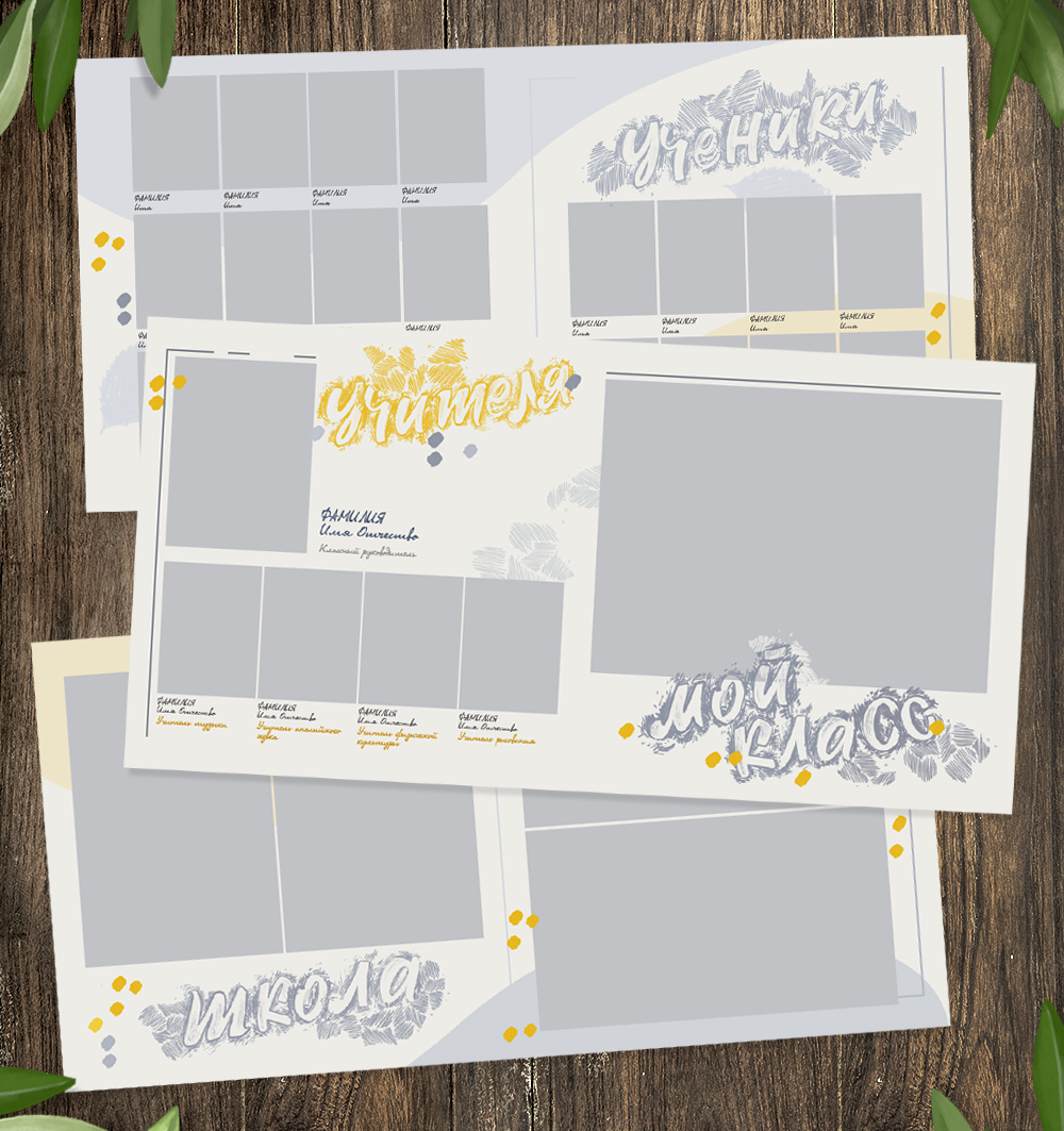 Слова "Выпуск", "Выпускной альбом", "Ученики", "Учителя", "Школа" отрисованы специально для макета (1 слово - 1 слой ).