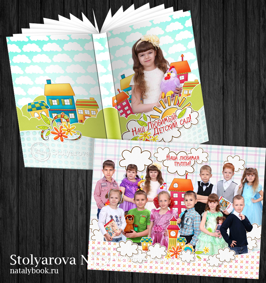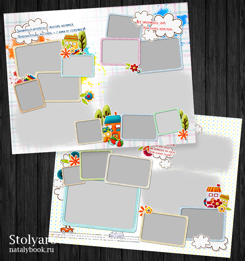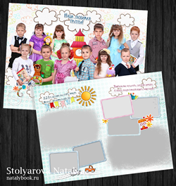 2 разворота для фото детей и 28 фото в рамках и масках на остальных разворотах. Все тексты в формате редактирования