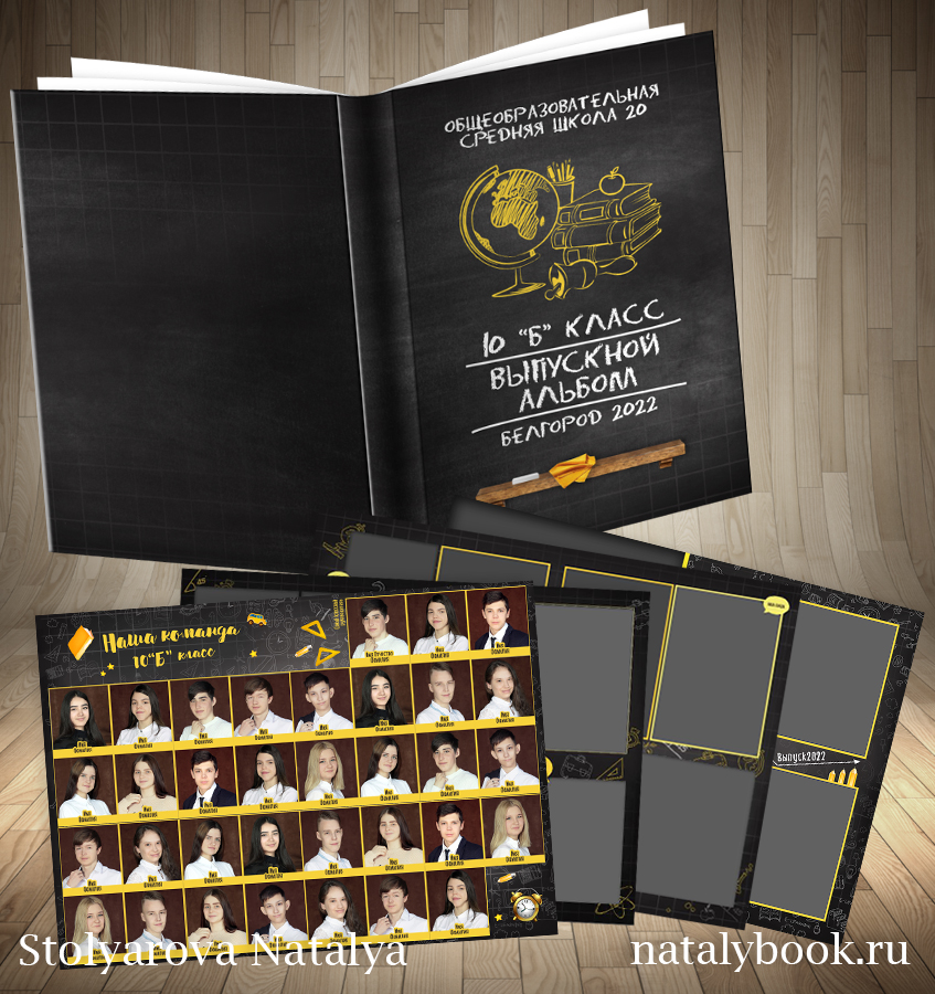 Фон разворота - белые рисунки. Предполагается, что выпускники фотографируются с желтой атрибутикой на фоне с белыми рисунками.