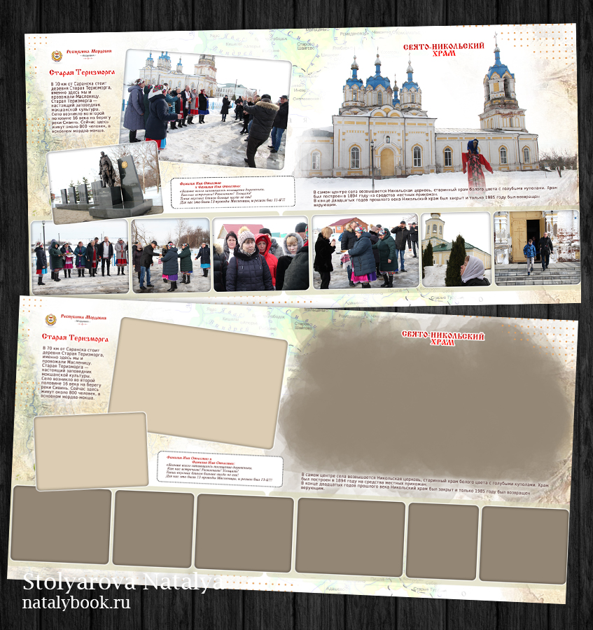 Макет был разработан для оформления поездки компании друзей в Саранск на Масленицу. В шаблоне оставлены карты, герб, все на отдельном слое и можно заменить на свои материалы.